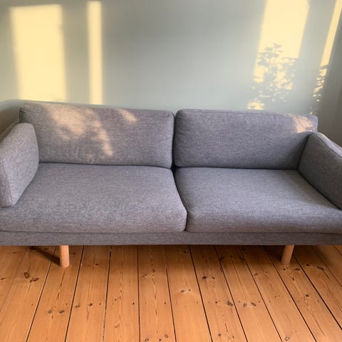 Den anden sofa står pænt, men er brugt, pris 2500 DKK