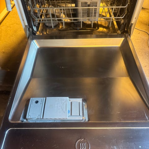 Indvendigt er der kurve til tallerkener på 27cm og en bestikholder. Maskinen kan tilsluttes direkte til vandhane