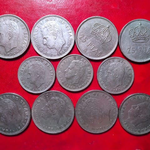 SPANIEN SPAIN ESPANA 15 x 5 Pesetas 1958, 1960, 1962, 1967, 1968, 1972, 1975, (1976, 1977, 1978, 1979, 1980 KOMPLET I SERIE!), 1981 FIFA, 1983, 1984 4 SLAGS! Francisco Franco & Juan Carlos I - Yes, that Juan Carlos that can't keep it in his pants! Prisen er for dem alle!!