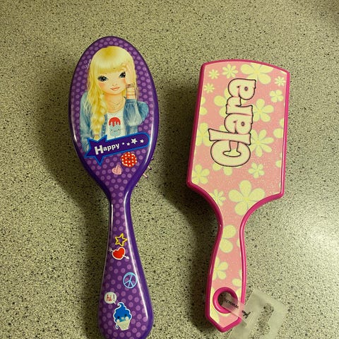 Top Model hårbørste i pink farve. Designet til børn med et motiv af to piger og teksten 'Good Vibes' på bagsiden. Børsten har plastikpigge og et ergonomisk håndtag.