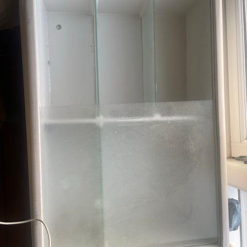 dette " vitrineskab " er et helt klassisk toilet skab ala fra omkring 1950. Lavet af træ og med to hylder og skydelåger af glas. Sidstnævnte hånddekoreret med blomstermotiver. Disse med slitage / alder, men stadig fine.