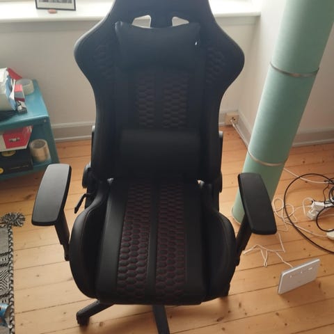 NIBE gamer-stol fra LEGEND bringer justerbar komfort og stil sammen, så du kan spille med selvtillid. Få behagelig nakkestøtte og lændestøtte med de medfølgende puder, og juster armlænene og ryglænet efter behov. Sædet er dækket med blødt, beige stof med hvide syninger i et grafisk mønster. B70 x H126-136 x D70 cm