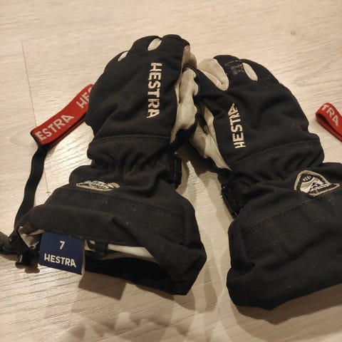 Hestra handsker i størrelse 7 med sort og hvid farve. Handskerne har justerbar rem ved håndleddet og er designet til at give beskyttelse og komfort. Materialet kombinerer holdbarhed og bevægelsesfrihed. Brugt 2 uger på ski.