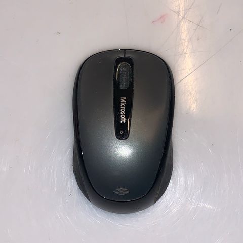 Trådløs mus med USB-modtager i sort og sølv. Designet til brug med computere, uden specifikke oplysninger om mærke eller model.