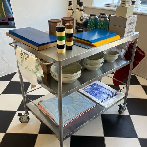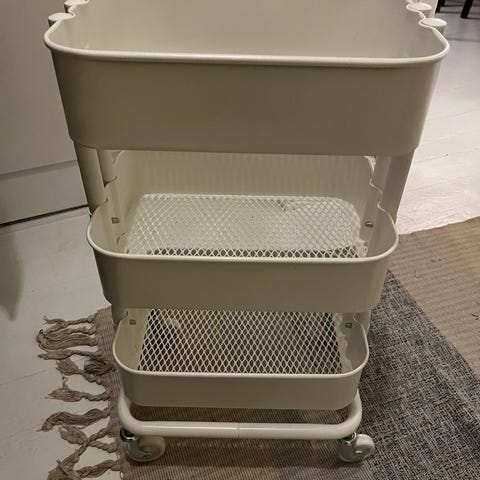 Industrielt IKEA rullebord i stål (modellen hedder Grundtal). Med en praktisk skjult skuffe øverst, samt en større trådkurv i bunden der også kan trækkes ud i siden. Også med flaskestativ og hylde, der kan flyttes rundt som det passer en bedst. Brugt i køkkenet, men sælges da jeg havde brug for noget mindre.