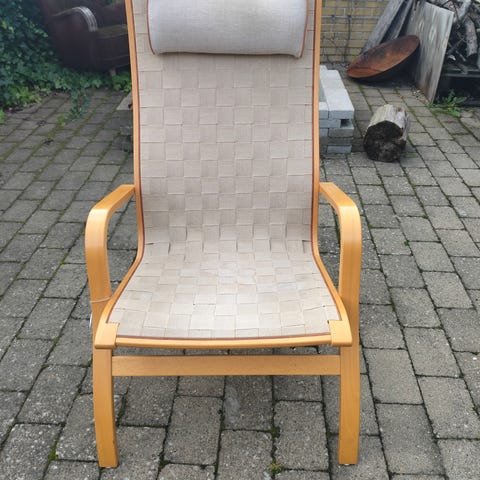 Lænestol i egetræ fra firmaet TripTrap, Denmark, med fodhviler. Stolen er betrukket med Uldstof. Den har meget god siddekomfort.