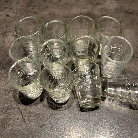 Glas, Medicinglas, Gamle medicinglas. I bunden står der, 10, 15 og 30. Ét af glassene str. 30 har yderligere HG mærket.