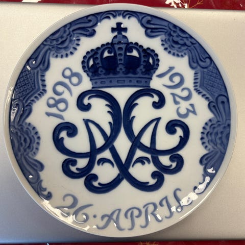 Oprindelse: Motivet er det samme, som blev brugt på den officielle danske 2-kroners sølvmønt, der blev udstedt i anledning af begivenheden i 1923. Den viste genstand er dog et kobberstik.