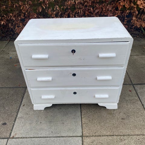 Ældre kommode i massivt træ som er malet af en tidligere ejer.
