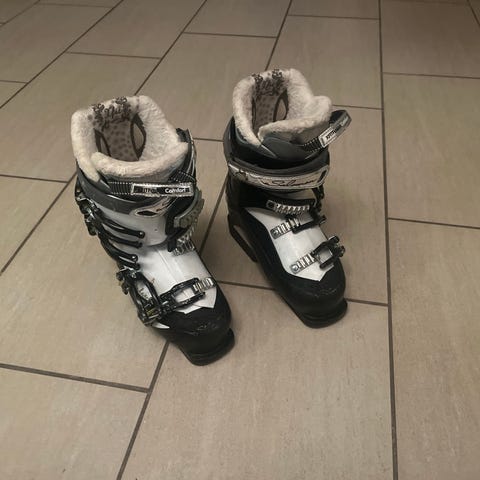 Salomon skistøvler i størrelse 25-255 mm. Farverne er sort og hvid. Støvlerne har flere spænder til justering og en robust sål.
