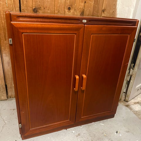 Pænt og solidt træskab i enkelt, klassisk design. Skabet har låger og en hylde, som kan tages ud, så det kan bruges fleksibelt til opbevaring. Velegnet til entré, stue, kontor eller børneværelse.