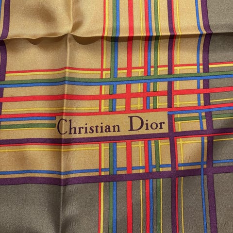 Christian Dior vintage silketørklæde fra 1970'erne med orange og lilla blomstermønster på gul baggrund. Christian Dior vintage silketørklæde fra 170'erne med orange og lilla blomstermønster på gul baggrund. God stand på originalemballagen.