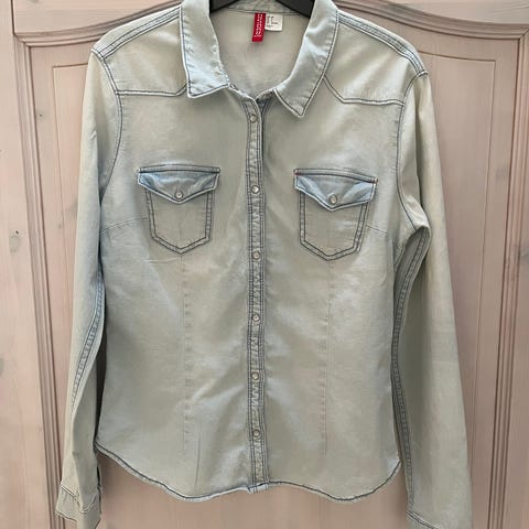 H&M skjorte i denim til kvinder i størrelse M. Skjorten er blå og lavet af denimmateriale. Den har lange ærmer og knaplukning foran.