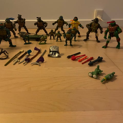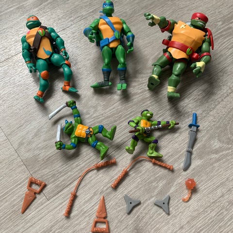 Teenage Mutant Ninja Turtles actionfigurer med tilbehør og helikopter. Figurenes farver og udstyr varierer. Sættet inkluderer flere figurer og en grøn helikopter med bevægelige dele.