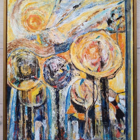 Stort og fint oliemaleri på lærred i friske og klare grønne, gule og blå farver. Desværre at ukendt kunstner.