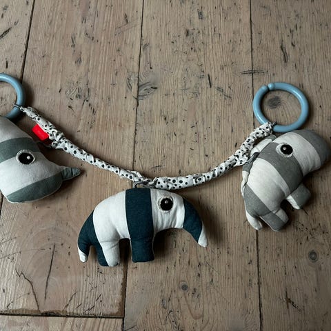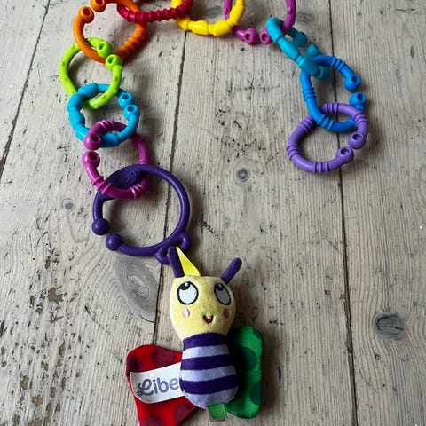 Baby rangle, baby kæde bidering med rangle og farverige ringe til børn. Legetøjet har et design med en ko og er lavet i materialer egnet til små børn.