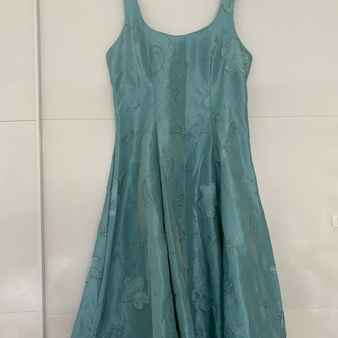Sød grøn (hjemmesyet) dansekjole med tynde stropper, med vidde i skørtet, yderstoffet er tyndt med blomster og mønster på, med skørt, lukkes med lynlås på ryggen.