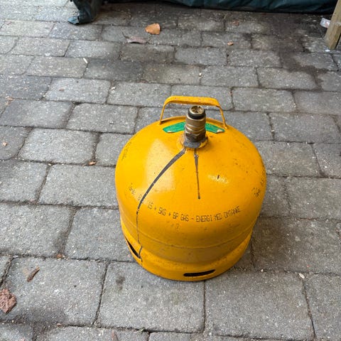 Gasflaske med en kapacitet på 5 kg, gul farve. Velegnet til brug med gasapparater, grill eller campingudstyr.