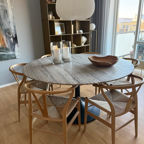 Eksklusivt rundt spisebord i travertin med elegant og tidløst udtryk.