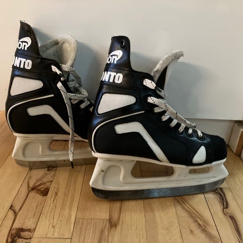 Alpina Ishockey skøjter i størrelse 39. Skøjterne er designet til ishockey og har en sort og hvid farve. Materialet består af tekstil og plastik. Egnet til børn.