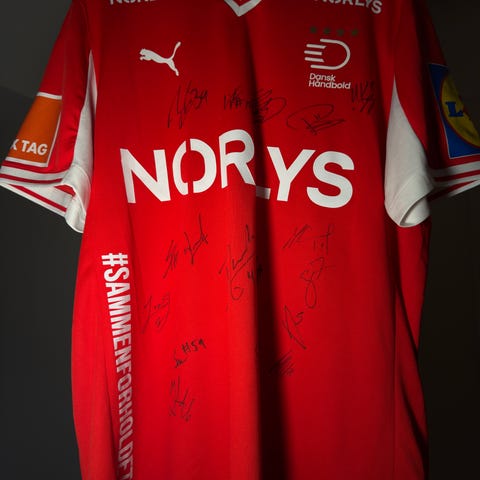 Håndbold Landsholdstrøje med autograf fra alle i vm truppen 2021, heriblandt Mikkel Hansen og Mathias Gidsel.