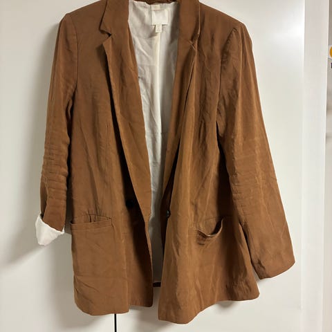 H&M blazer til kvinder i størrelse 42. Jakken er sort og lavet af smørblød viskose. Den har et enkelt design med knaplukning og foring indvendigt.