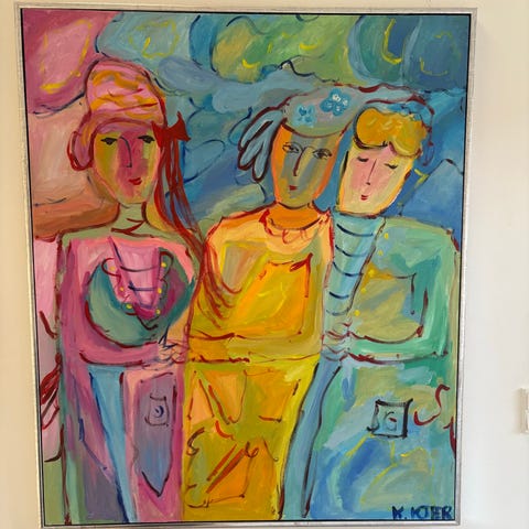 Fedeste farverige maleri, med små collage detaljer. 120x120cm. Jeg kan ikke huske kunster navn, kun at hun hedder Elisabeth.