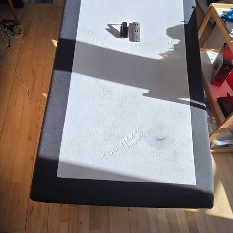 Madrassen har et enkelt skjold- midt på madrassen- så det vil umiddelbart ikke være at se, med en skånemadras/topmadras samt lagen.