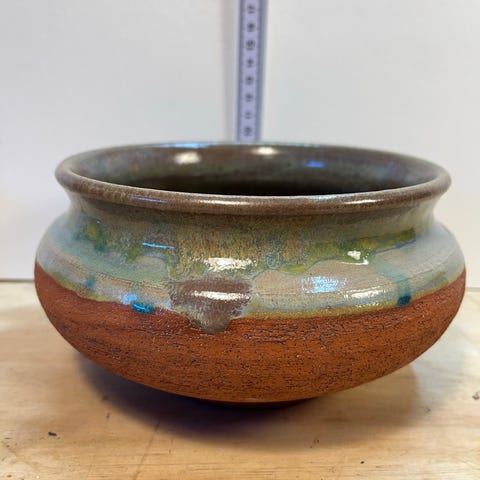 Denne skål er på størrelse med en salatskål og er signeret LHJ 84. Jeg ved ikke hvem der er, men det er ikke amatørværk. Den er drejet og meget ensartet. Fin glasur med let dekoration.