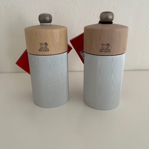Næsten ny og ubrugt peberkværn Bali Fonte fra Peugeot i støbejern plus hvid saltkværn sælges, nypris 850kr, begge del er kun brugt få gang og fremtræder som ny !