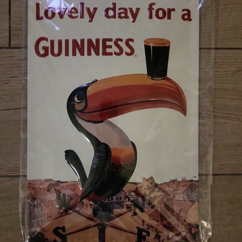Sælger et dekorativt Guinness metalskilt med teksten “Lovely day for a Guinness”. Skiltet har et klassisk retrolook og et farverigt design med det ikoniske tukan-motiv og bybaggrund. Perfekt som dekoration til bar, køkken, mandehule eller hjemmebar.