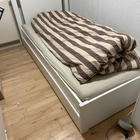 Sengen er i fin stand og skuffer kører som de skal. Der er intet galt med sengen (men teenageren ønsker en større seng).