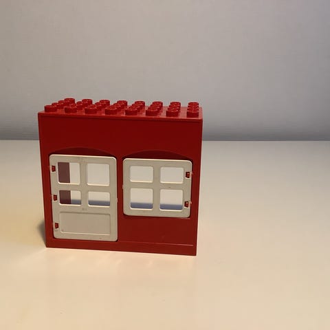 Familiehus med spisekøkken og børneværelse. Far’en er lige kommet hjem med indkøbene. Bedstefar og bedstemor sidder og ser fjernsyn, og børnene leger i børneværelset. De har en køjeseng, der kan skilles ad til individuelle senge. De leger med en bamse og en stor dukke. De har også farvekridt og bøger. Døren er åben (Den står ved siden af som åben, og skubbes ind for at lukke den)