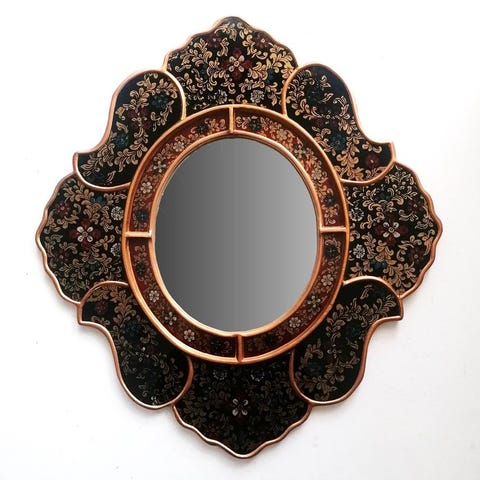 Harrison & Gil håndhugget forgyldt trævæg spejl fremstillet i USA; mahogni-lignende ramme, sort kant og ophæng, mål 50 x 32 cm og dybde 3 cm, indvendig spejlareal 41 x 23 cm, i god brugt stand med mindre tegn på ælde og pletter. Klik på den blå "gå til varen" knap, for at købe eller byde på denne vare. Den samlede pris vil blive vist inden du afgiver dit bud.
