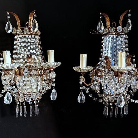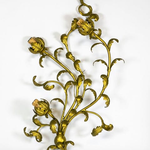 Par retrovante vægurler fra Italien, ca. 1950'erne, Capodimonte-stil med smedet jernstruktur gildet i guld og håndmalede farvede porcelænsblomster; hver lampe har to lyskilder med træ-fittings i form af lysestage og E14-stik, i alt fire fatninger for hele sættet, dimensioner pr. lampe: 43 cm høj, 24 cm bred, 10 cm fra væggen; generelt i god brugt stand med original patina. Klik på den blå "gå til varen" knap, for at købe eller byde på denne vare. Den samlede pris vil blive vist inden du afgiver dit bud.