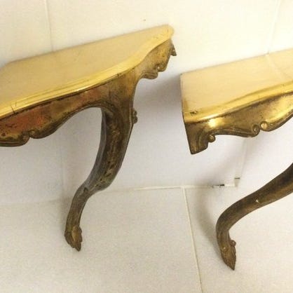 Antik gilded trævægkonsol fra Italien, dateret til 1950–1960, i god stand med patina, måler 20 cm i højden, 43 cm i bredden og 15 cm i dybden, kaldet A gilded wall console. Klik på den blå "gå til varen" knap, for at købe eller byde på denne vare. Den samlede pris vil blive vist inden du afgiver dit bud.