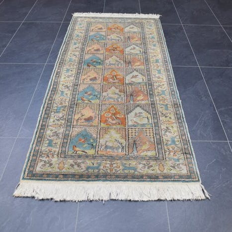 Türkisk Kayseri-design håndknyttet silke-på-silke orientalsk tæppe, ca. 214 × 89 cm, brugt og professionelt renset. Klik på den blå "gå til varen" knap, for at købe eller byde på denne vare. Den samlede pris vil blive vist inden du afgiver dit bud.