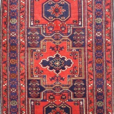 Et autentisk værk med det umiskendelige geometriske design fra Kaukasus' folk, der fremhæver dets to symmetriske centrale medaljoner, omgivet af blomstermotiver og traditionelle kanter.