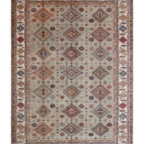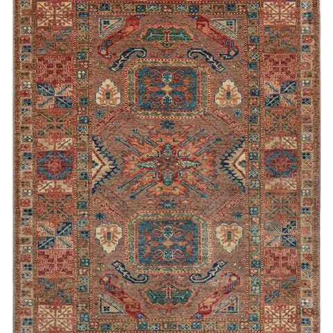 Denne håndknyttede designer-tæppe begejstrer med sit traditionelle Kazak-mønster, der er kendt for klare geometriske former, kraftige farver og udtryksfulde ornamenter. Den harmoniske kombination af varme jordfarver, turkis, rød, grøn og accentfarver giver tæppet en livlig, men stadig afbalanceret udstråling.