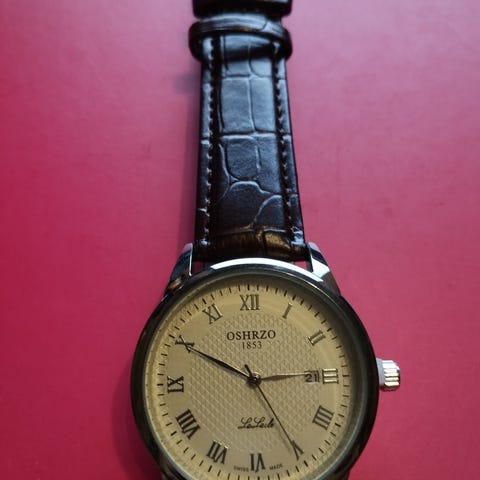 Omega herreur med metalarmbånd og rund urskive. Uret har datovisning og analogt display. Farven er guldtonet.ikke omega