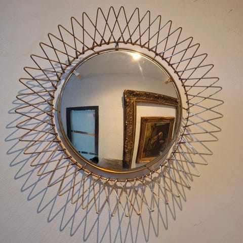 Objektet, der vises på billedet, er et solspejl eller et sunburst-spejl, et populært dekorativt element. Disse vægspiegel har ofte en metalramme formet som solstråler eller blade, som ses på billedet, og de forbindes normalt med vintagestilen eller midtårhundredets stil (50'erne/60'erne).