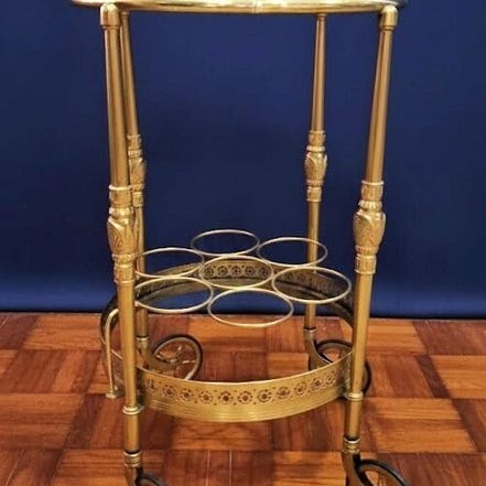 Vintage serveringsvogn i forgyldt messings og glas, én genstand, Italien, dybde 76 cm, højde 67 cm, bredde 42 cm, i god stand med mindre alderstegn og pletter, anslået periode 2023. Klik på den blå "gå til varen" knap, for at købe eller byde på denne vare. Den samlede pris vil blive vist inden du afgiver dit bud.