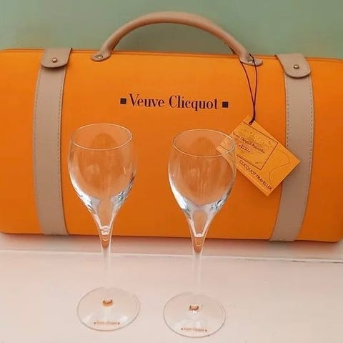Det polstrede topstykke i orange kunstlæder, med Veuve Cliquot-emblemet gravet i sort, tilføjer et strejf af luksus og eksklusivitet.