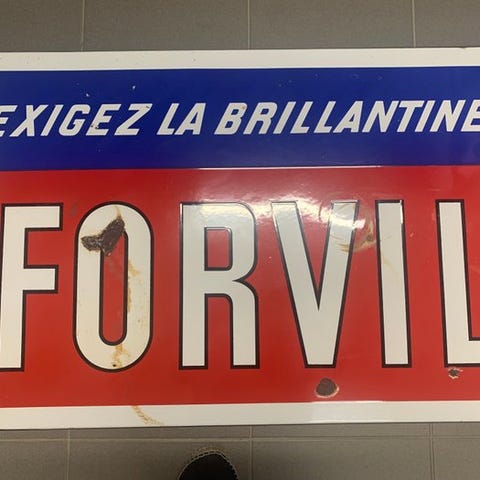Emaljeret buet plade fra Le Ciment Arme Demay Freres Reims, Frankrig, skønnet 1940–1950, i god stand med nogen slid og alderspletter; højde 20 cm, bredde 30 cm; oprindelse Reims; original. Klik på den blå "gå til varen" knap, for at købe eller byde på denne vare. Den samlede pris vil blive vist inden du afgiver dit bud.