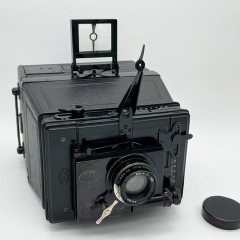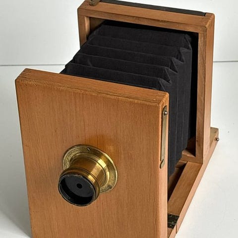 Tilsigtet Gilles frères, en 13x18 gearet tørkollodiumkamera, meget sjælden, i meget god fysisk stand og ikke testet, ca. 1850–1900. Klik på den blå "gå til varen" knap, for at købe eller byde på denne vare. Den samlede pris vil blive vist inden du afgiver dit bud.