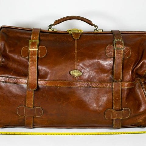 Brun italiensk læderrejse-taske i maxi størrelse, 60 x 30 x 30 cm, i pæn stand med nogle brugsspor, med skulderrem, sidelomme med magnetiske lukninger, fødder og meget ren indvendig; pletter på læderet som vist. Klik på den blå "gå til varen" knap, for at købe eller byde på denne vare. Den samlede pris vil blive vist inden du afgiver dit bud.