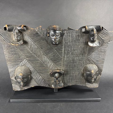 Sjældne er de gamle Lega-statuer, der bliver solgt på Catawiki. Hørende til Centralafrika (DR Congo), er dette karakterfulde stykke både sjældent og dybt udtryksfuldt. Den kendetegnes ved et meget læseligt skulpturelt udtryk: et sammenpresset legeme, opbygget af kompakte volumener, et bredt hoved med et kraftfuldt blik, og en bevidst stilisering, der kondenserer det væsentlige af Lega-sproget. Det samlede giver en umiddelbar tilstedeværelse,