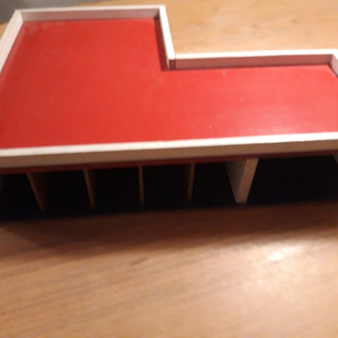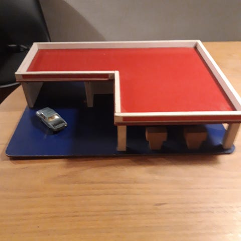 Garage, Tankstation i træ fra ca. 1930, Gammel tankstation i træ fra ca. 1930. Lygtepælene er massiv jern og indgraveret i toppen med følgende: Ford R, USA-IS samt nr 1, 2 og 3. En del aldersrelaterede brugsspor. Mål: L 44cm, B 33cm, H 14cm incl. skilt.