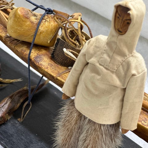 Rara og smuk dukke fra Kwakiutl-stammerne i Alaska. Den blev erhvervet under en særlig rejse i 40'erne. Den er blevet bevaret i god stand og beskyttet mod insektsangreb.
