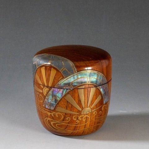 Dette værk, med titlen „Tsubaki-mon usucha-ki“ (椿紋薄茶器), Camellia-mønstret tevare, blev skabt af Ōshita Kōsen (大下香仙), en respekteret lakmester fra Kanazawa og elev af mesteren Ōshita Sekka (1874–1960).